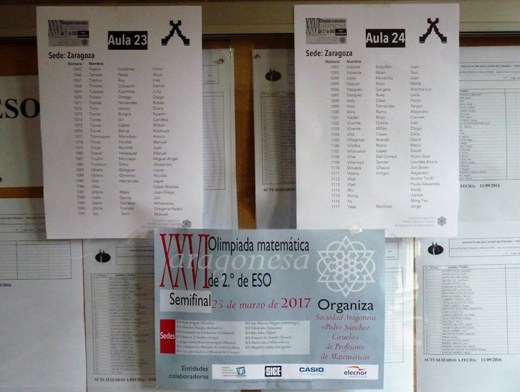 Con una participación de casi mil alumnos que procedían de 115 centros educativos de todo Aragón, se celebró el pasado 25 de marzo de 2017 la Semifinal de la XXVI Olimpiada Matemática Aragonesa en las 13 sedes repartidas por toda la geografía de la comunidad autónoma.