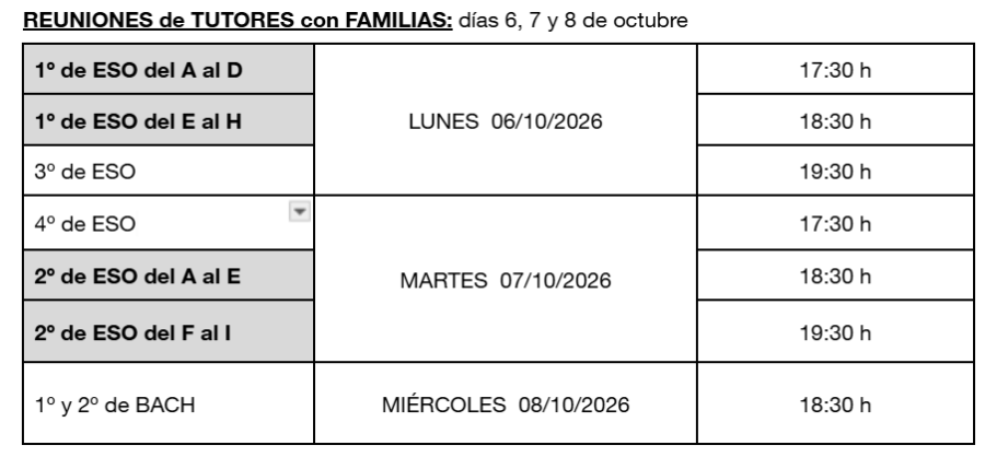 Calendario de las reuniones con las familias de ESO y Bachillerato (por curso/nivel) del IES Torre de los Espejos de Utebo el 6, 7 y 8 de octubre de 2025.